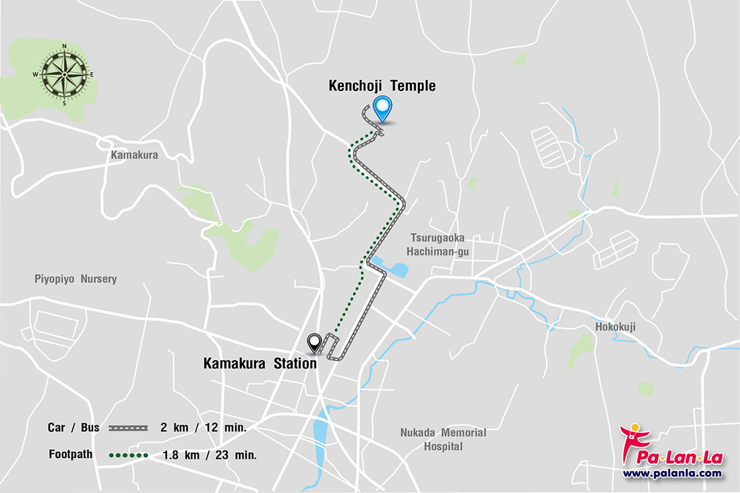 - เดิน (Footpath) จาก Kamakura Station ไปยัง Kenchoji Temple มีระยะทางประมาณ 1.8 กิโลเมตร ใช้เวลาเดินทางประมาณ 23 นาที