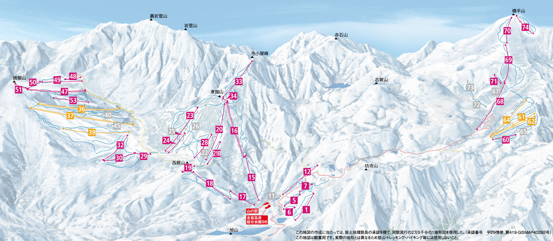 แผนที่ลานสกีต่างๆ ภายในพื้นที่ของชิกะโคเก็นสกีรีสอร์ท แถบตัวเลขสีชมพูคือลานสกีที่เปิดให้บริการ แถบตัวเลขสีเหลืองคือลานสกีที่เปิดให้บริการเป็นบางส่วน และแถบตัวเลขสีเทาคือลานสกีที่ปิดให้บริการ (ขอขอบคุณภาพจาก https://www.shigakogen-ski.com/map / ข้อมูลปี 2021)