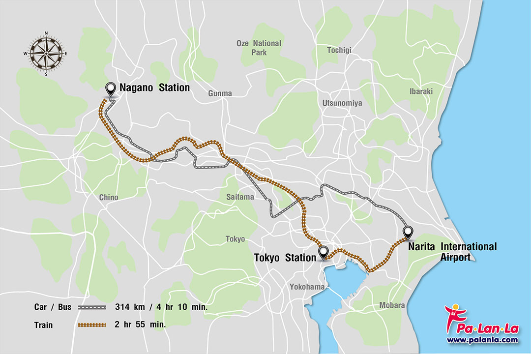 - รถยนต์ (Car) จาก Narita International Airport ไปยัง Nagano Station โดยขึ้นทางด่วน มีระยะทางประมาณ 314 กิโลเมตร ใช้เวลาเดินทางประมาณ 4 ชั่วโมง 10 นาที