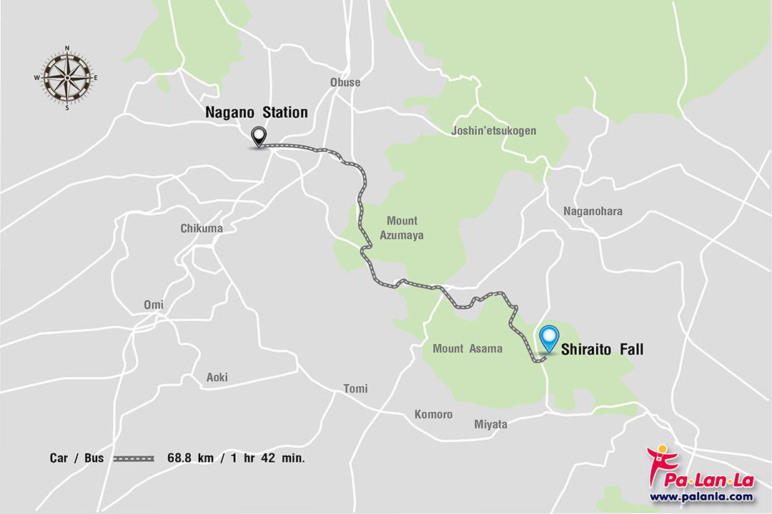 - รถยนต์ (Car) จาก Nagano Station ไปยัง Shiraito Fall มีระยะทางประมาณ 68.8 กิโลเมตร ใช้เวลาเดินทางประมาณ 1 ชั่วโมง 42 นาที
