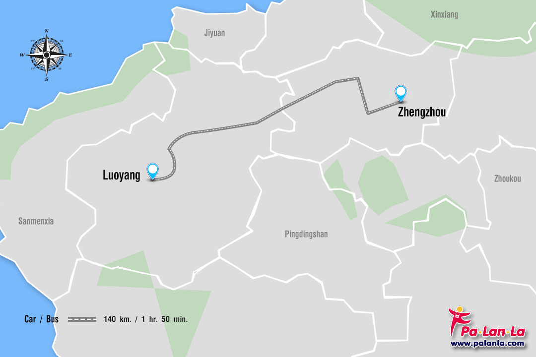 มณฑลเหอหนาน มีเมืองที่ใหญ่ที่สุดและเป็นศูนย์กลางของเศรษฐกิจคือเมืองเจิ้งโจว (Zhengzhou) การเดินทางโดยรถยนต์จากเมืองเจิ้งโจวไปเมืองลั่วหยาง (Luoyang) ซึ่งเป็นที่ตั้งของถ้ำหินหลงเหมิน มีระยะทาง 140 กิโลเมตร ใช้เวลาเดินทางประมาณ 1 ชั่วโมง 50 นาที