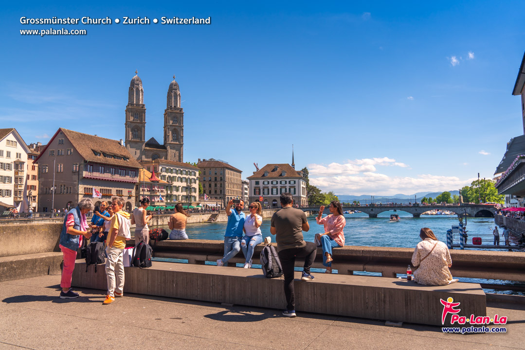 บรรยากาศดีๆ ริมแม่น้ำลิมมัต มองเห็นหอคอยสูงคู่แฝดอันโดดเด่นของโบสถ์กรอสมุนสเตอร์เป็นฉากหลัง