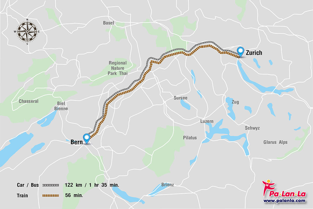 - รถยนต์ (Car / Bus) Bern อยู่ห่างจาก Zurich 122 กิโลเมตร ใช้เวลาเดินทางโดยรถยนต์ 1 ชั่วโมง 35 นาที