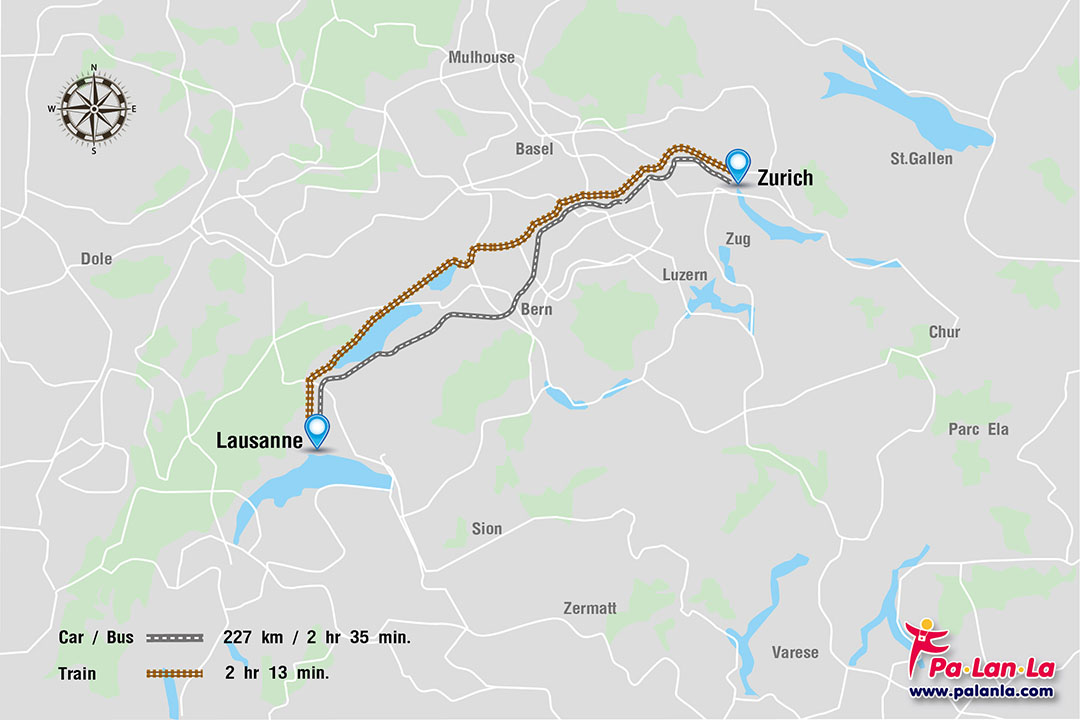 - รถยนต์ (Car / Bus) Lausanne อยู่ห่างจาก Zurich 227 กิโลเมตร ใช้เวลาเดินทางโดยรถยนต์ 2 ชั่วโมง 35 นาที