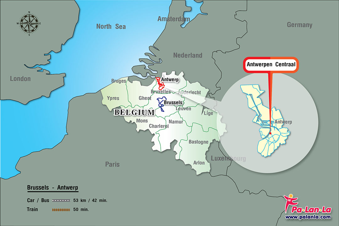 - รถยนต์ (Car / Bus) จากสถานีรถไฟกลางเมืองบรัสเซลส์ ไปยังสถานีรถไฟกลางเมืองแอนต์เวิร์ป ระยะทางประมาณ 53 กิโลเมตร ใช้เวลาเดินทางประมาณ 42 นาที