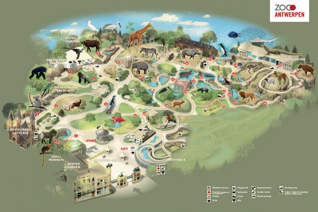 แผนที่แสดงจุดต่างๆ ภายในสวนสัตว์แอนต์เวิร์ป (ขอบคุณภาพประกอบจาก https://www.zooantwerpen.be/en/)