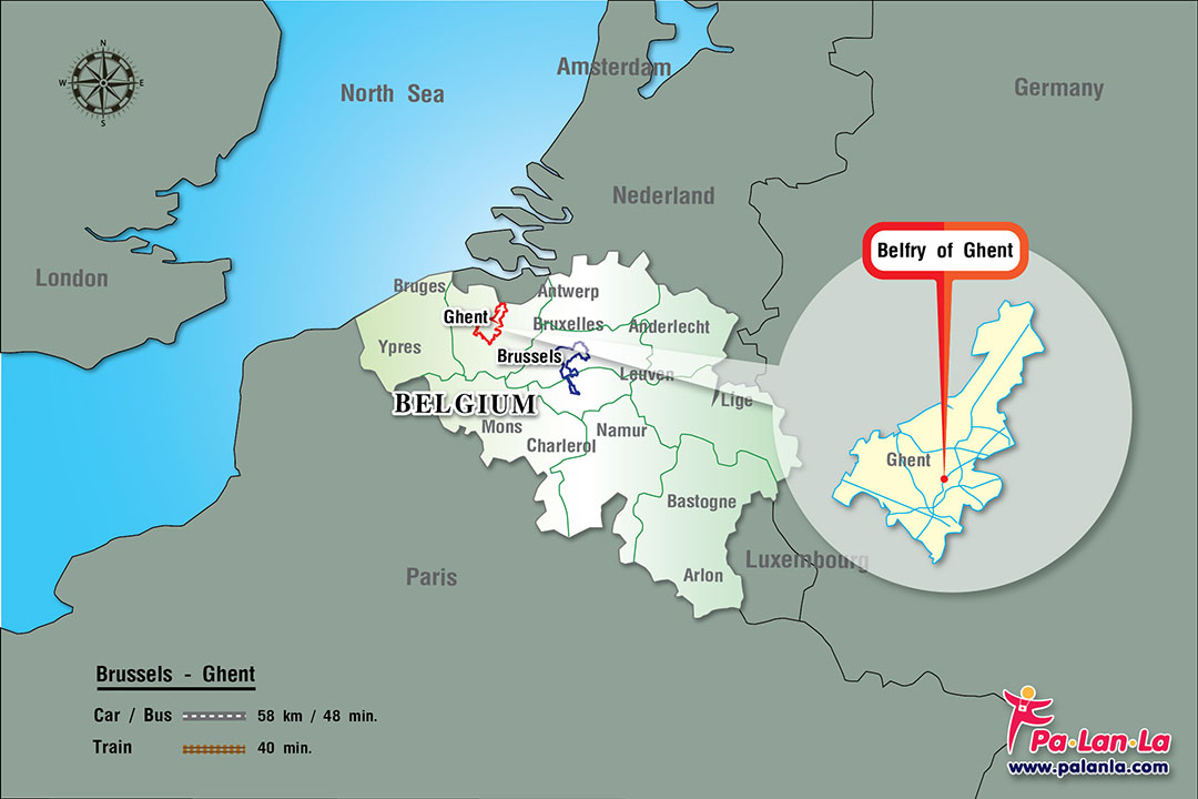 - รถยนต์ (Car /Bus) จากสถานีรถไฟกลางเมืองบรัสเซลส์ ไปยังสถานีรถไฟกลางเมืองเกนต์ ระยะทางประมาณ 58 กิโลเมตร ใช้เวลาเดินทางประมาณ 48 นาที