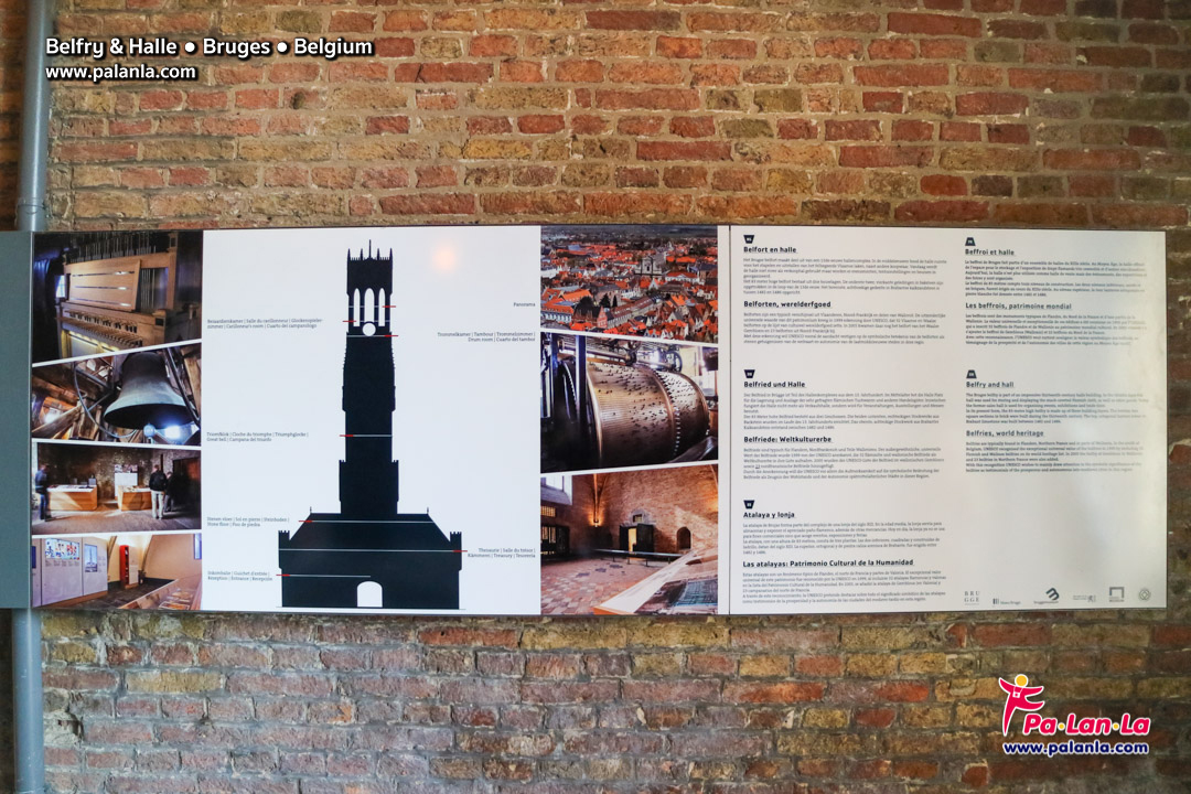 ภายในหอคอยเมืองบรูจส์เก็บระฆังไว้มากถึง 57 ใบ ซึ่งระฆังใบที่มีชื่อเสียงที่สุดมีชื่อว่า Victory Bell มีขนาดกว้าง 2 เมตร น้ำหนักราว 6,000 กิโลกรัม และหากเดินขึ้นบันได 366 ขั้นขึ้นไป จากด้านบนหอคอยจะสามารถชมวิวรอบสวยๆ รอบเมืองบรูจส์ได้แบบสุดลูกหูลูกตา