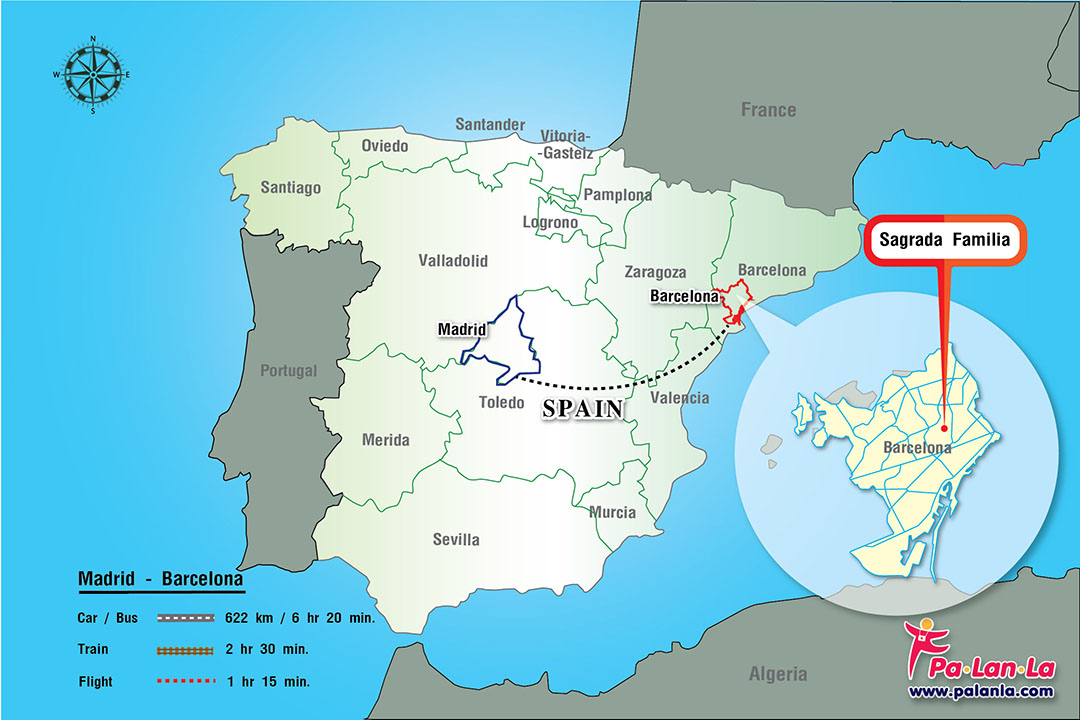 - รถยนต์ (Car / Bus) จากเมืองมาดริดไปยังเมืองบาร์เซโลนา ระยะทาง 622 กิโลเมตร ใช้เวลาเดินทางประมาณ 6 ชั่วโมง 20 นาที
