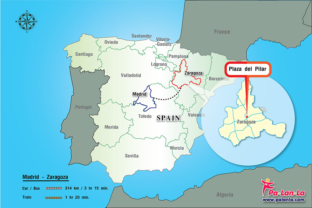 - รถยนต์ (Car / Bus) จากเมืองมาดริดไปยังเมืองซาราโกซา ระยะทาง 314 กิโลเมตร ใช้เวลาเดินทางประมาณ 3 ชั่วโมง 15 นาที