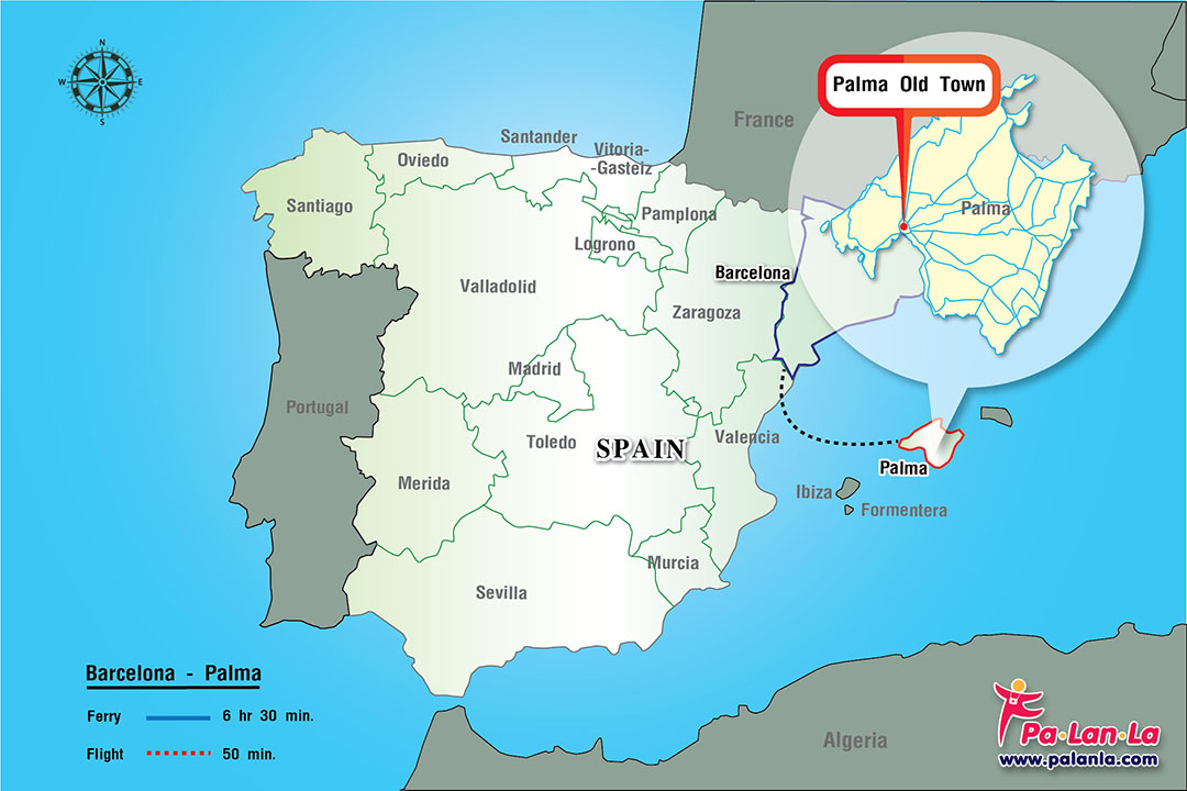 จากเมืองบาร์เซโลนาไปยังปาลมา (เกาะมายอร์ก้า) ระยะทางรวม 255 กิโลเมตร สามารถเดินทางไปได้โดยวิธีต่างๆ ดังนี้