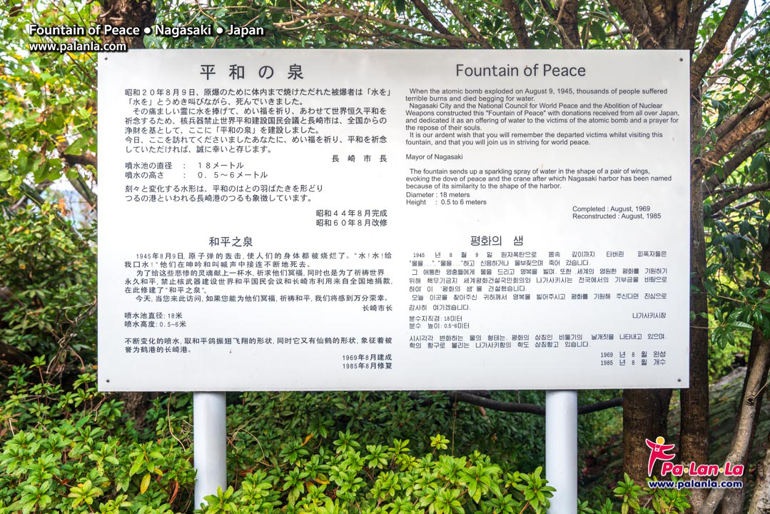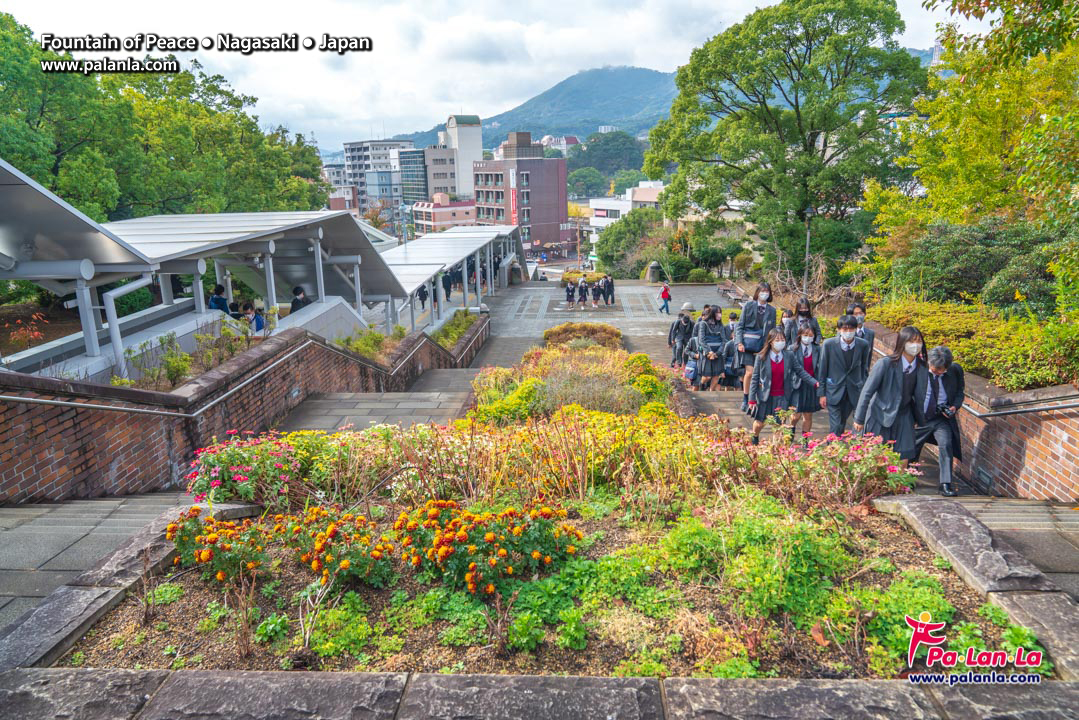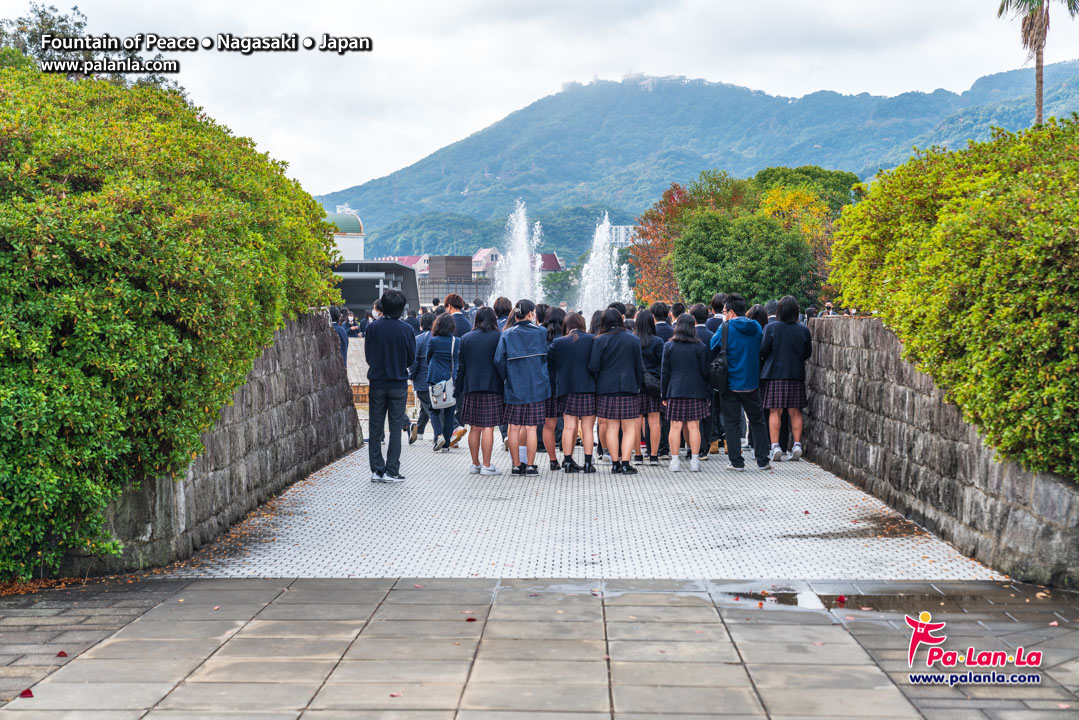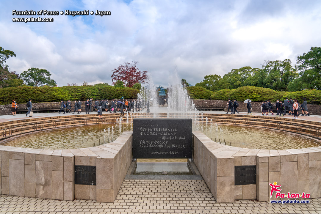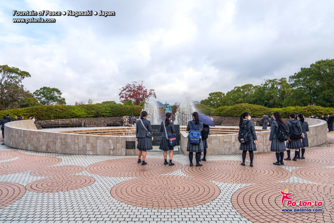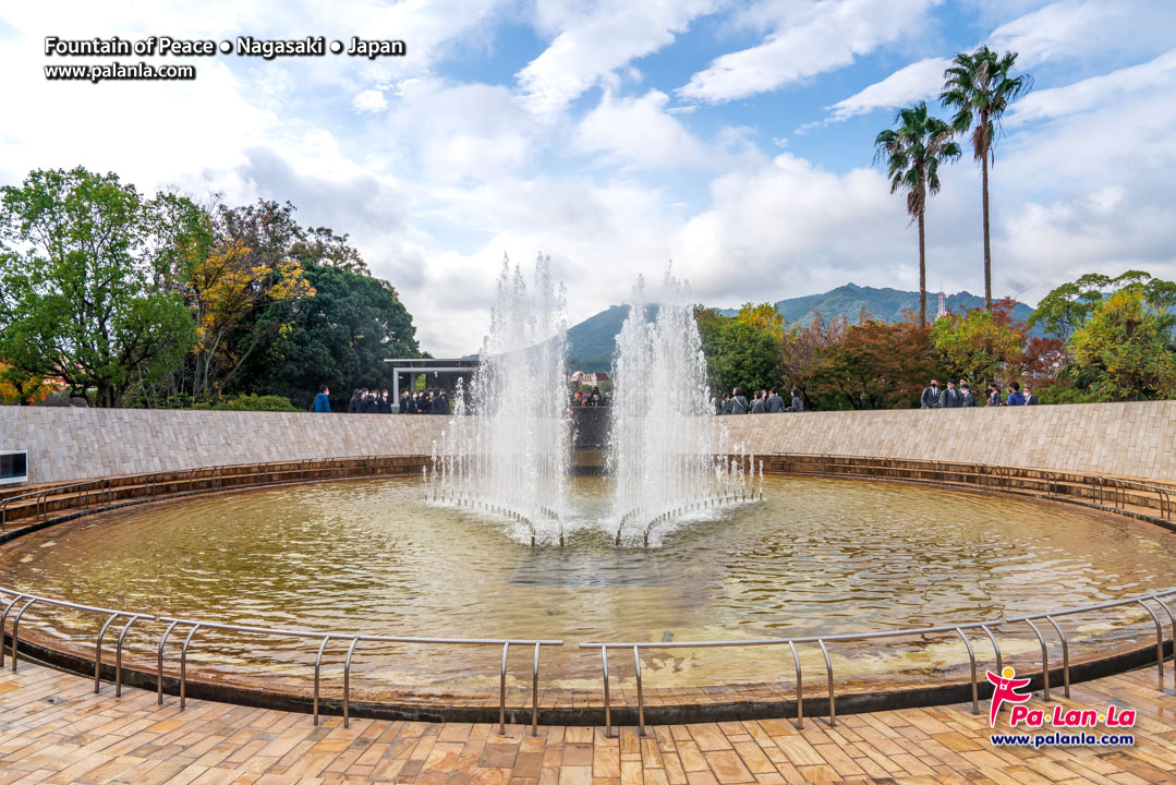 น้ำพุแห่งสันติภาพ (Fountain of Peace) ตั้งอยู่ด้านหน้าของสวนสันติภาพนางาซากิ (Peace Park) สวนสาธารณะที่สร้างขึ้นเพื่อรำลึกถึงเหตุการณ์ระเบิดปรมาณูในสงครามโลกครั้งที่ 2 ซึ่งครั้งหนึ่งเมืองนางาซากิเคยถูกระเบิดปรมาณูถล่มเป็นเหตุทำให้ประชาชนเสียชีวิตนับแสนในเหตุการณ์ครั้งนั้น