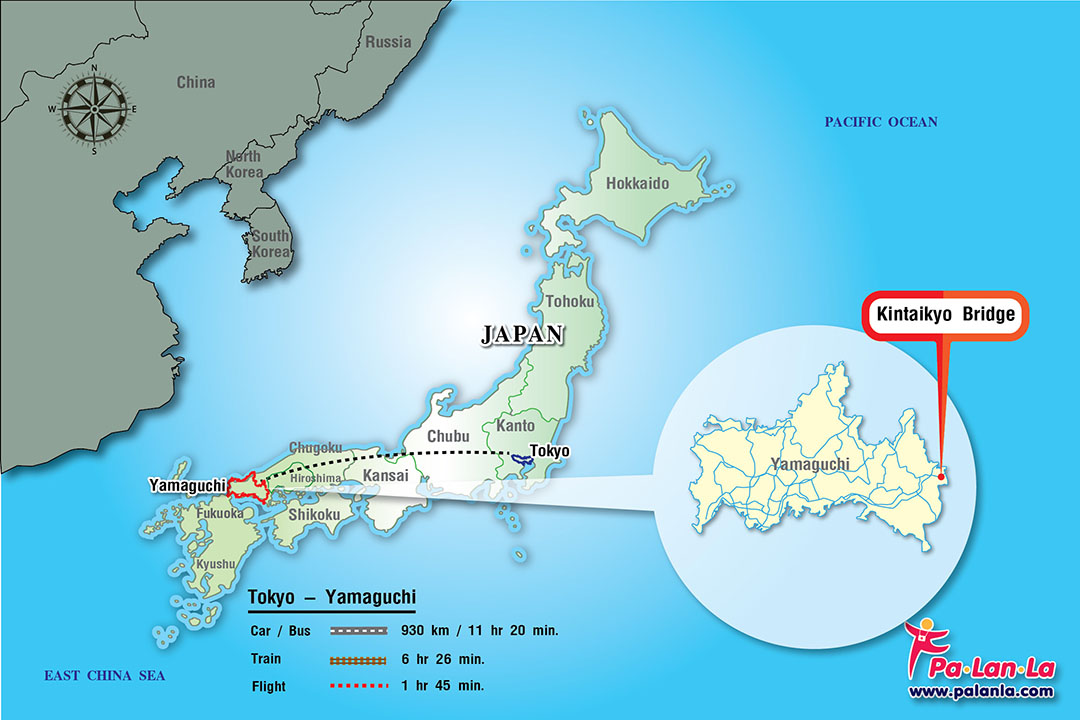 จาก Yamaguchi Station ขึ้นรถไฟสาย Yamaguchi Line LocalShin-Yamaguchi ไปลงที่ Shin-Yamaguchi Station จากนั้นเปลี่ยนไปขึ้นรถไฟชินคันเซนสาย Tokaido-Sanyo Shinkansen เพื่อไปลงที่ hin-Iwakuni Station แล้วนั่งรถประจำทางสาย 21 ไปลงที่ป้าย Kintaikyo ได้เลย ใช้เวลาเดินทางทั้งหมดประมาณ 1 ชั่วโมง 35 นาที