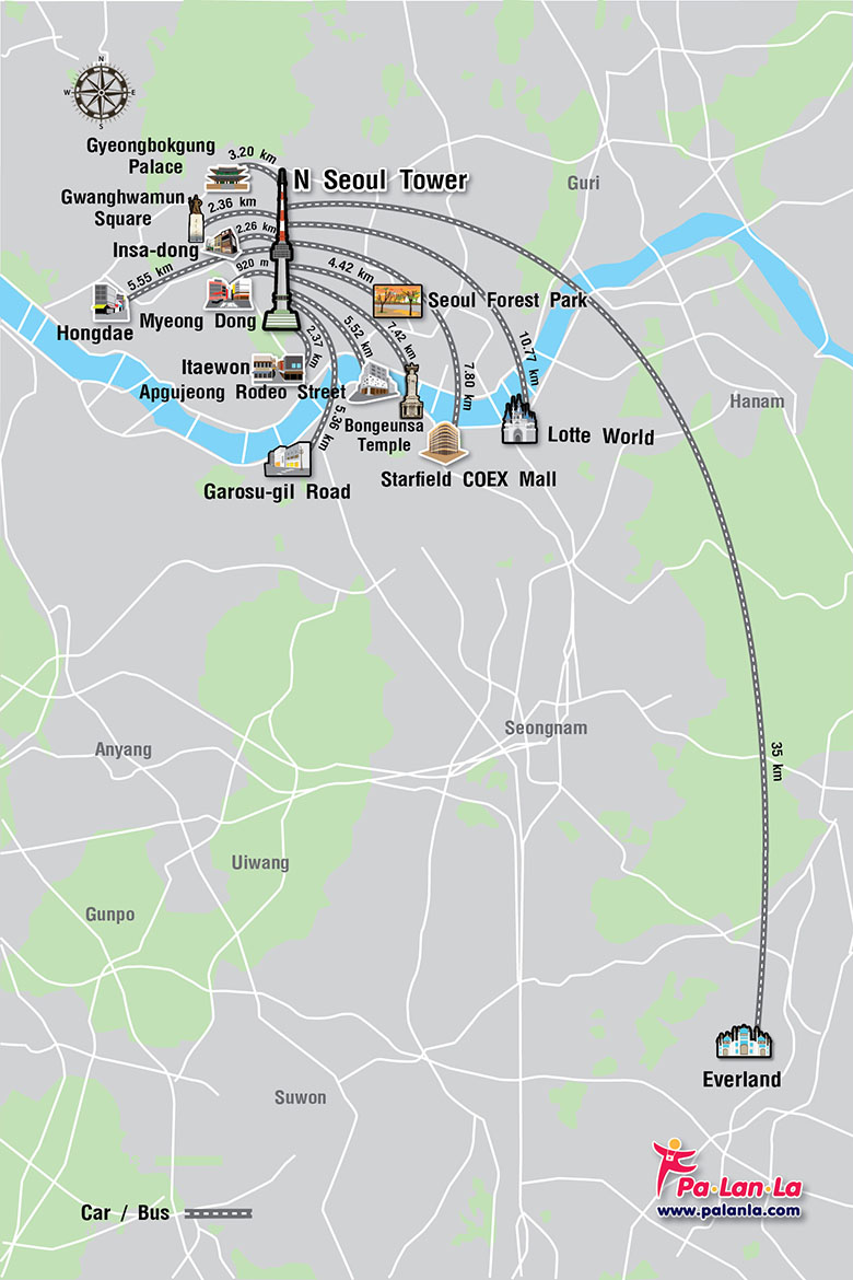 การเดินทาง : ลงรถไฟใต้ดินสถานี Myeong-dong แล้วออกทางออก 1 แล้วเดินต่อไปยัง N Seoul Tower ราว 500 เมตร