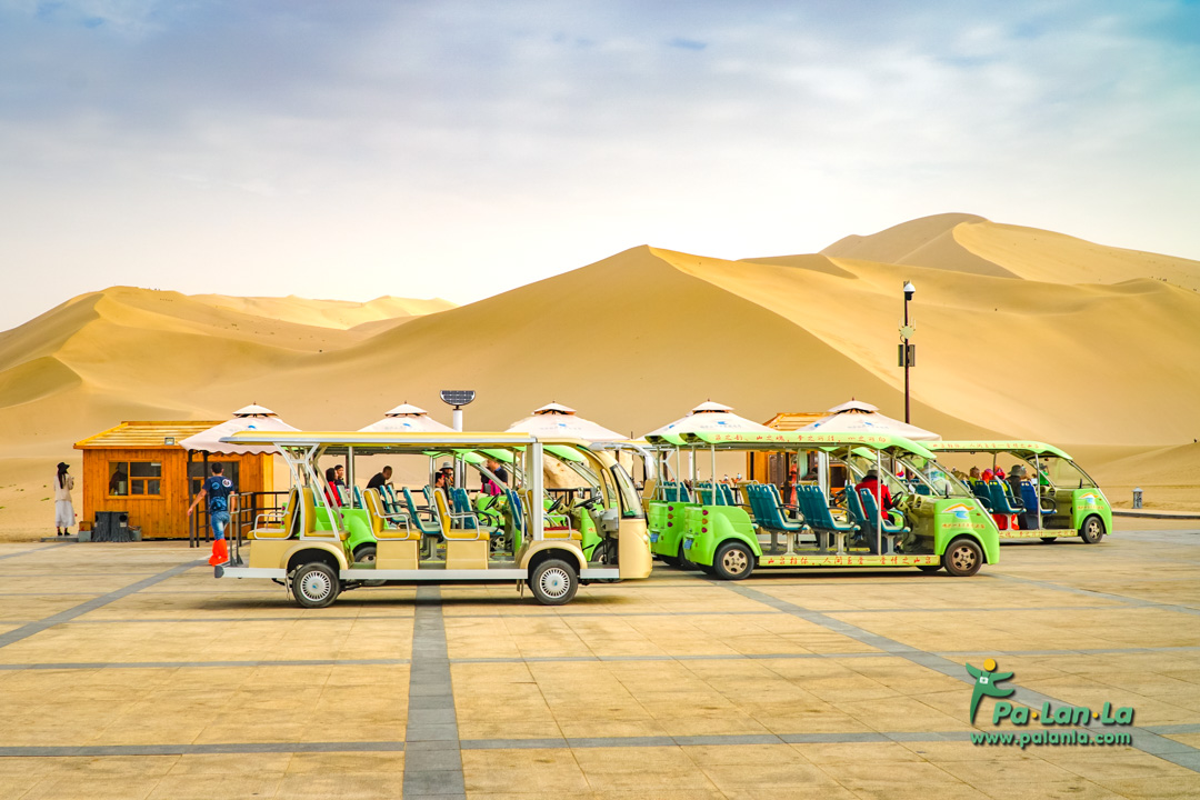 - รถโดยสารสาธารณะ จากเขตตุนหวง นักท่องเที่ยวสามารถใช้บริการรถโดยสารสาธารณะหมายเลข 3 จากในตัวเมือง และลงที่จุดจอดหน้าทางเข้าทะเลสาบพระจันทร์เสี้ยวและเนินทรายกระซิบได้ โดยมีค่าบริการเพียง 1 หยวน/คน