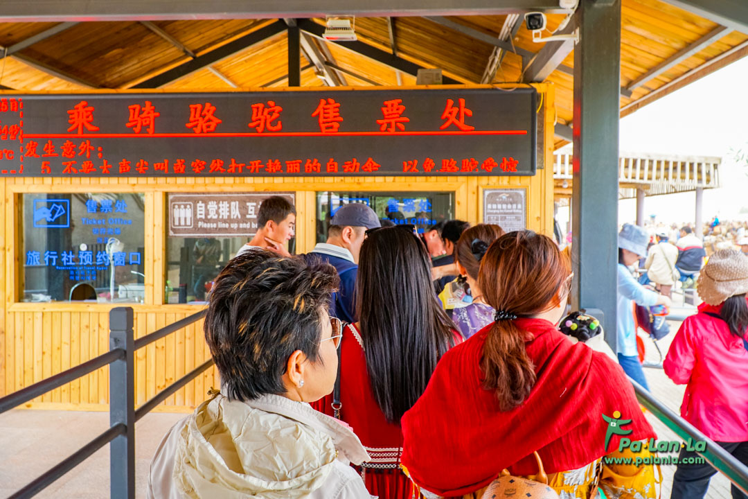 นักท่องเที่ยวที่ต่อแถวรอนั่งอูฐเพื่อเดินทางผ่านทะเลทราย