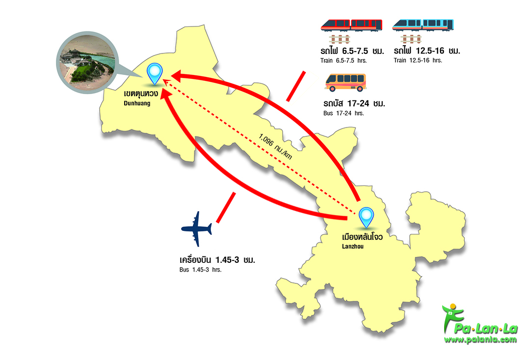 เมืองหลันโจวเป็น เมืองเอกของมณฑลกานซู อยู่ห่างจากเขตตุนหวงประมาณ 1,096 กิโลเมตร การเดินทางต่อไปยังเขตตุนหวง นักท่องเที่ยวจึงสามารถเลือกเดินทางได้หลายวิธี คือ