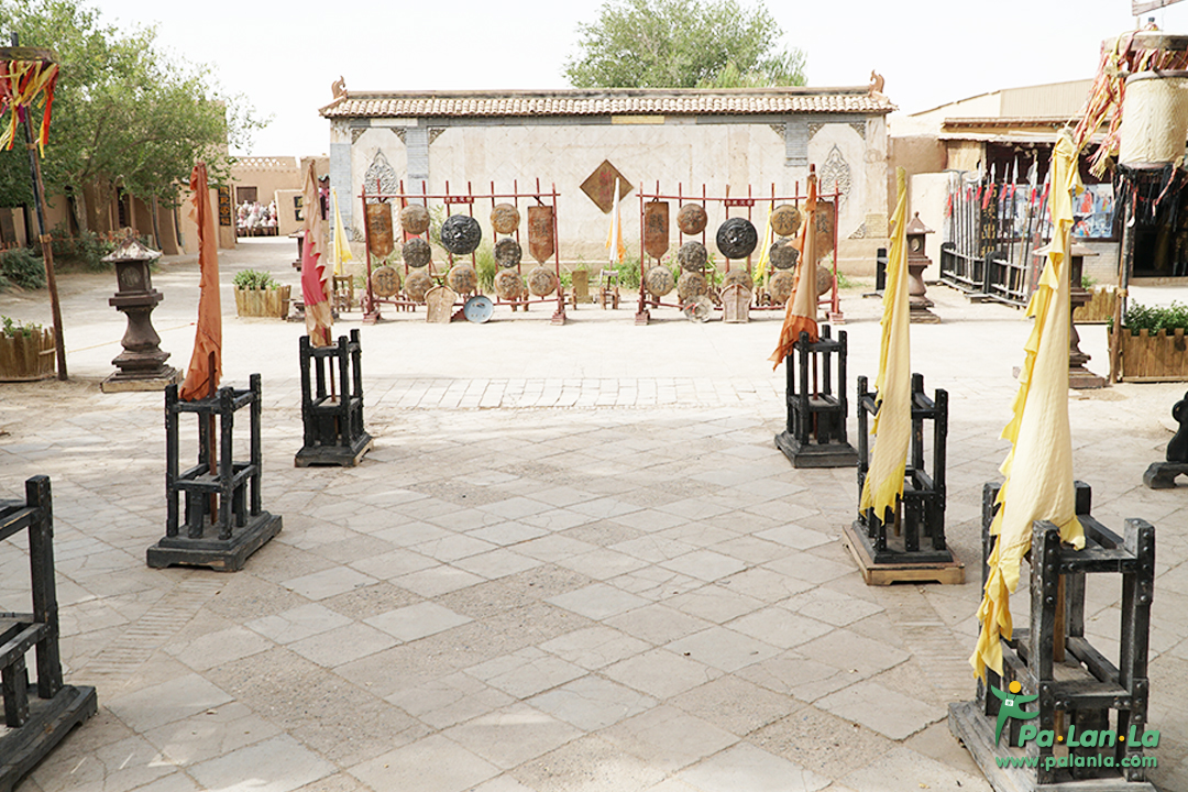เดิมที เมืองโบราณ หรือสถานที่ถ่ายทำภาพยนตร์แห่งนี้นั้น ถูกสร้างเพื่อถ่ายทำภาพยนตร์ความร่วมมือจีน-ญี่ปุ่นเรื่อง “The Silk Road” (หรือรู้จักกันในชื่อ “Dun-Huang” , 1988) โดยตัวเมืองถูกออกแบบให้เป็นรูปสี่เหลี่ยม ตามอย่างม้วนภาพวาด “ทิวทัศน์ริมแม่น้ำคราวเทศกาลชิงหมิง” หรือภาพเมืองซาโจวในสมัยราชวงศ์ซ่ง (960-1279)