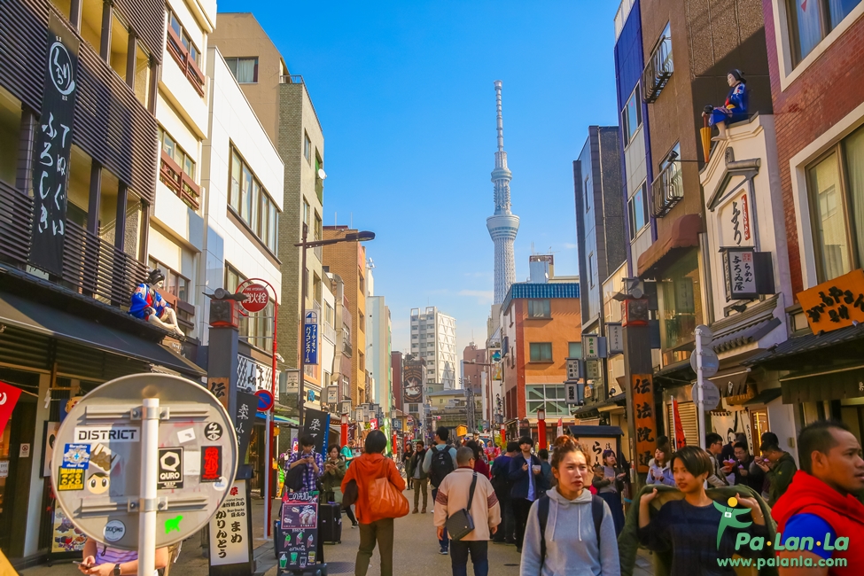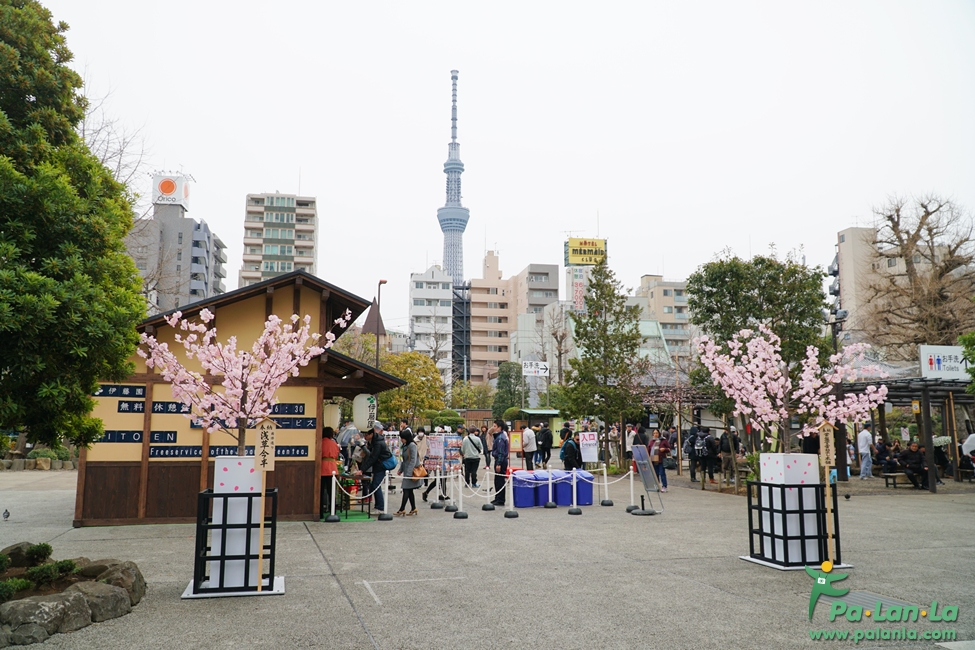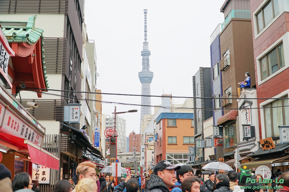 จากหน้าวัดเซนโซจิ โตเกียวสกายทรีอยู่ห่างออกไปเพียงคนละฝั่งของแม่น้ำ