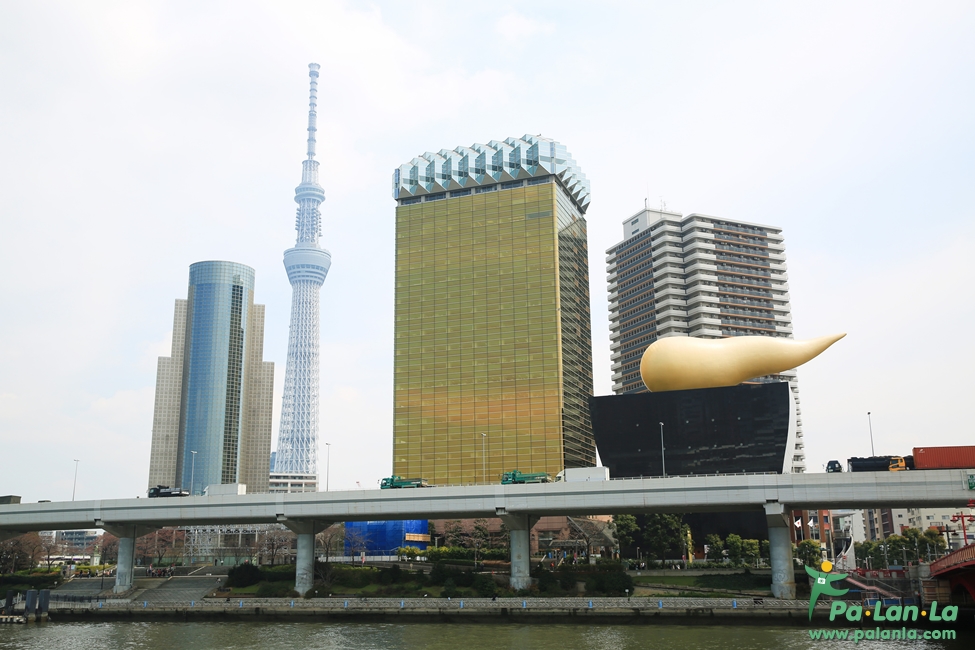 ทิวทัศน์ยอดนิยมของโตเกียวสกายทรี คือมุมจากฝั่งตรงข้ามของแม่น้ำซึ่งมองเห็นรูปทรงอันแปลกจาของตึก Asahi