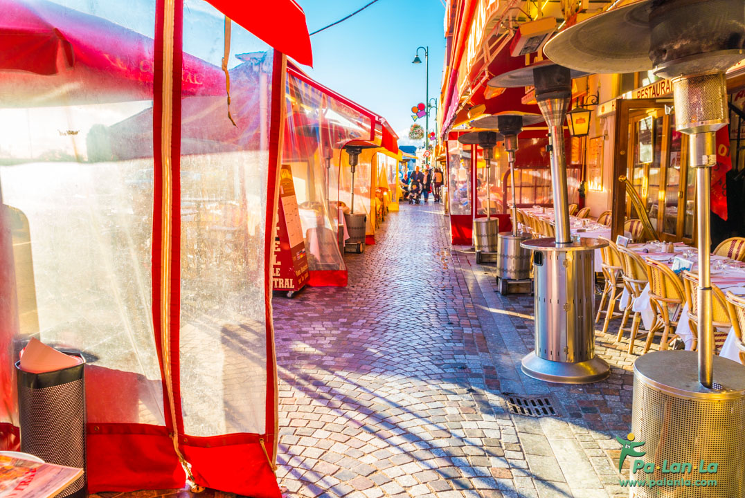 กลางเมืองโดวิลล์ที่มีทางแยกไปร้านอาหารซึ่งหลายร้านเปิดบริการหลายเวลา