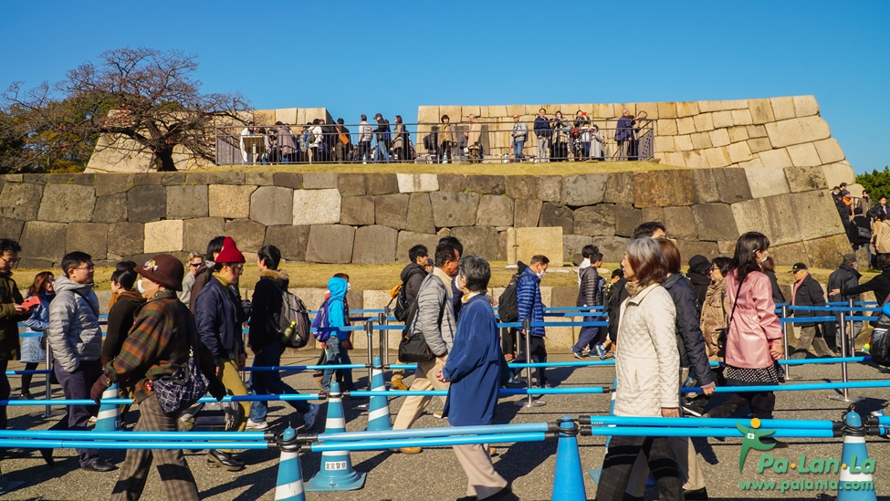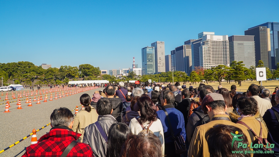 แถวยาวของผู้คนจำนวนมากที่รอเข้าไปเยี่ยมชมพระราชวังหลวงโตเกียว