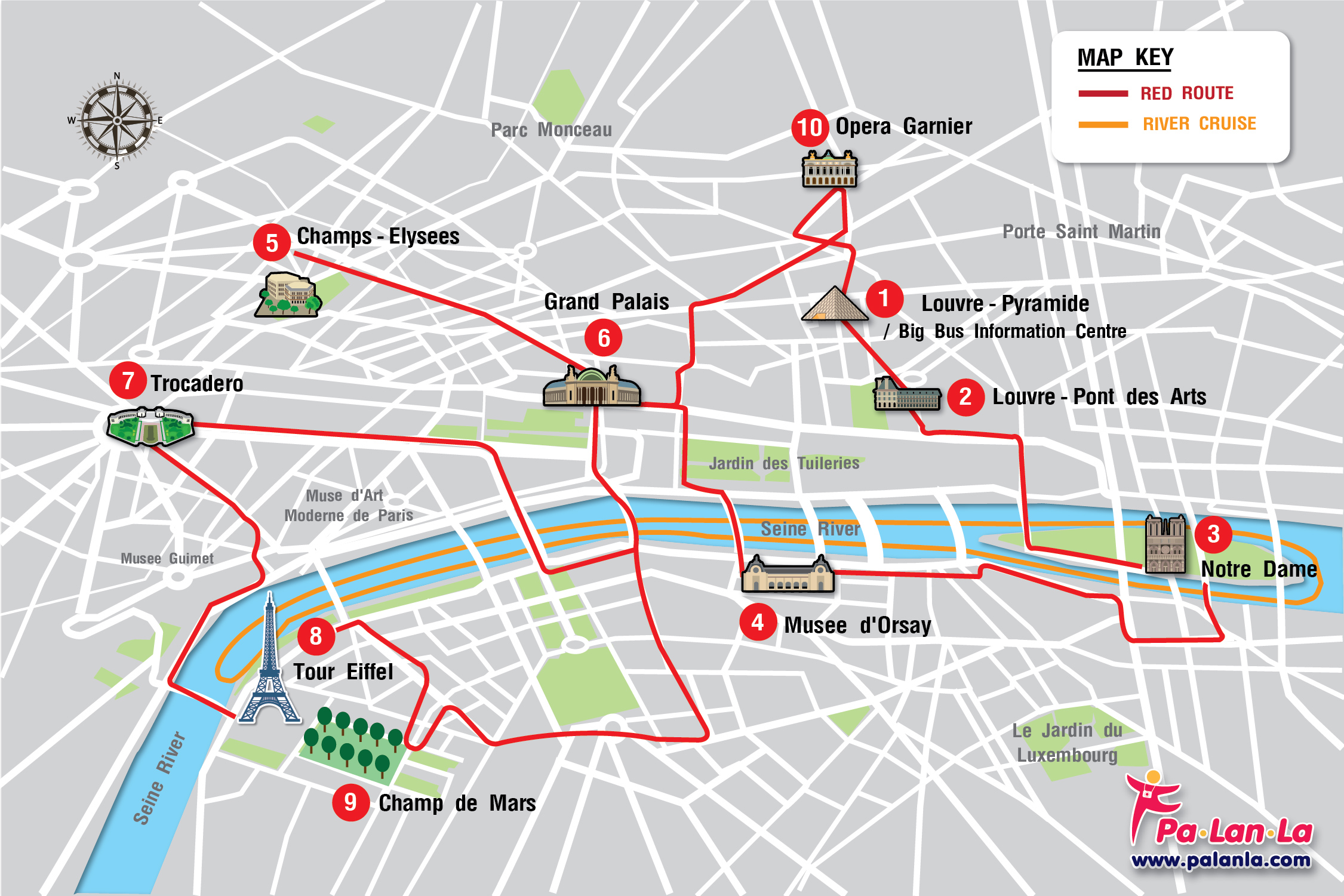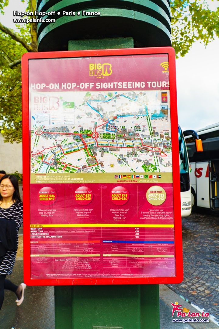 - ช่วงเวลาให้บริการ : รถคันแรกจะออกจาก จุดขึ้นรถ หมายเลข 1 พีระมิดลูฟวร์/ ศูนย์ให้บริการข้อมูล Big Bus ตั้งแต่เวลา 09.45 น. และคันสุดท้ายออกจาก จุดขึ้นรถ หมายเลข 1 เวลา 17.30 น.