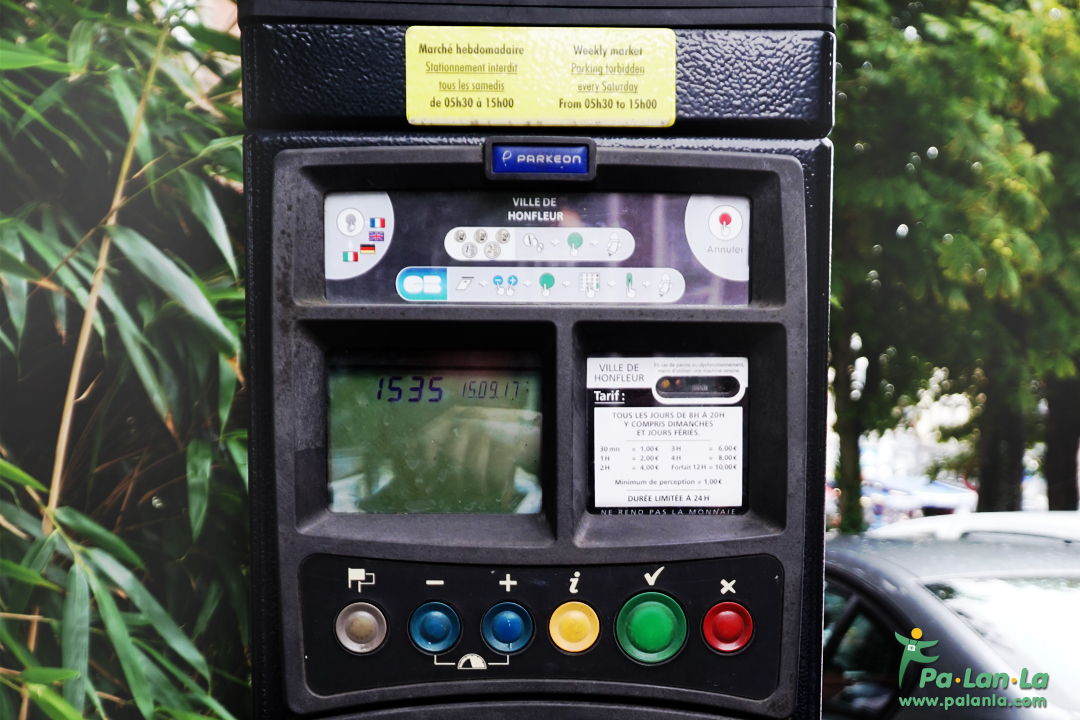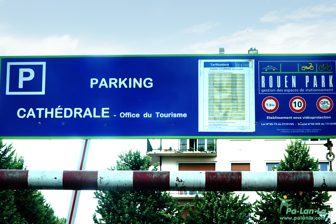 ป้ายบอกราคาที่จอดรถใกล้มหาวิหารแห่งรูอ็อง ซึ่งมีค่าบริการ 3 ชั่วโมงครึ่งเป็นเงิน 7 ยูโร