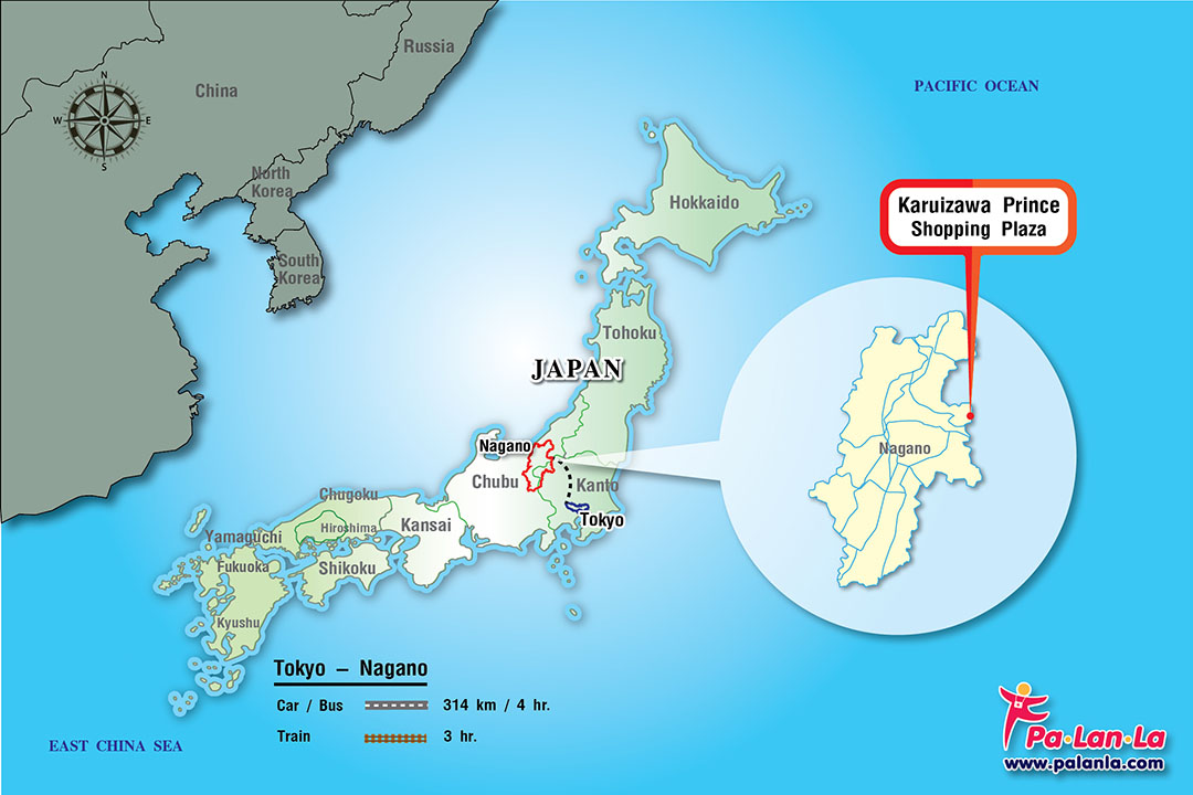 - รถยนต์ (Car) จาก Nagano Station ไปยัง Karuizawa Prince Shopping Plaza มีระยะทางประมาณ 76 กิโลเมตร ใช้เวลาเดินทางประมาณ 1 ชั่วโมง 20 นาที