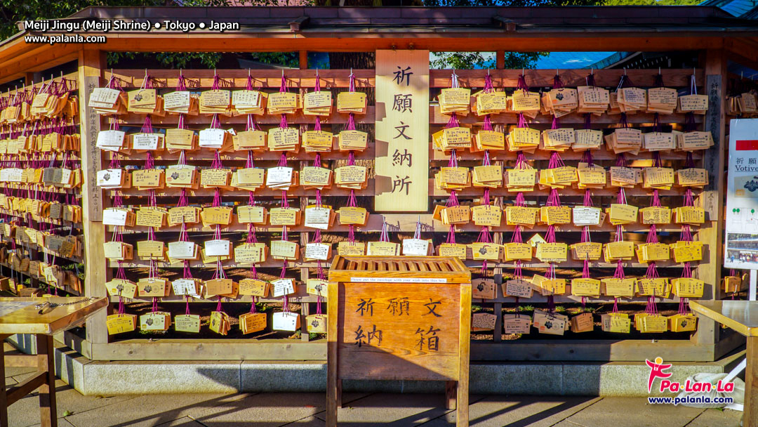ป้ายขอพรจำนวนมากถูกแขวนเรียงรายอยู่ใกล้กับอาคารศาลเจ้า
