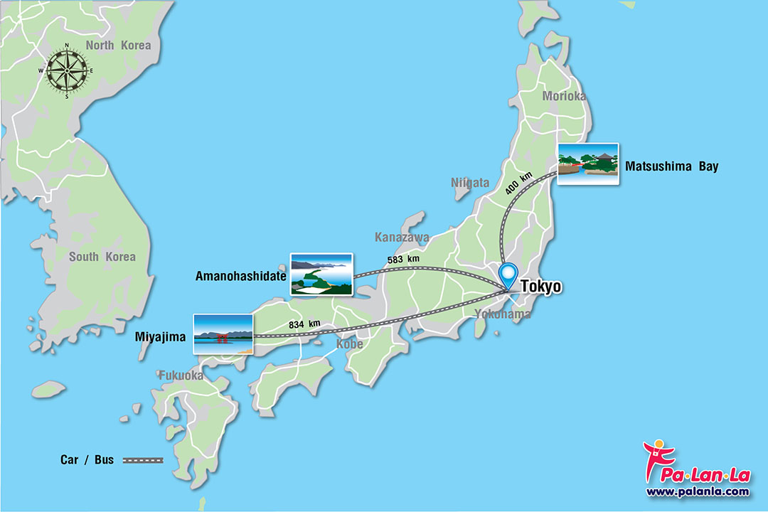 แผนที่แสดงตำแหน่งที่ตั้งของ 3 จุดชมวิวที่สวยที่สุดในญี่ปุ่น