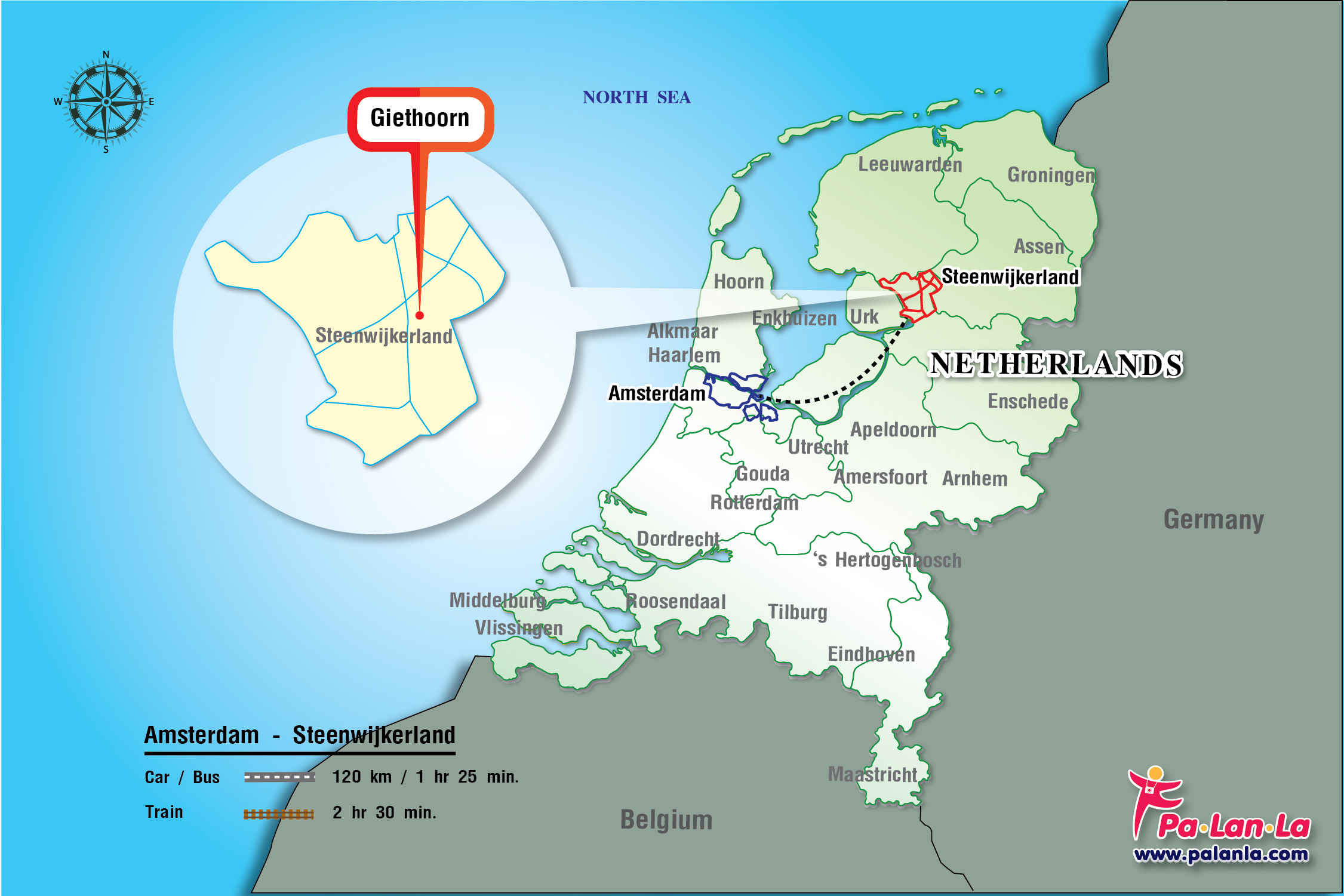 - รถยนต์ (Car/Bus) จากสถานีรถไฟกลาง Amsterdam Central ไปยัง Giethoorn มีระยะทาง 120 กิโลเมตร ใช้เวลาเดินทางประมาณ 1 ชั่วโมง 25 นาที
