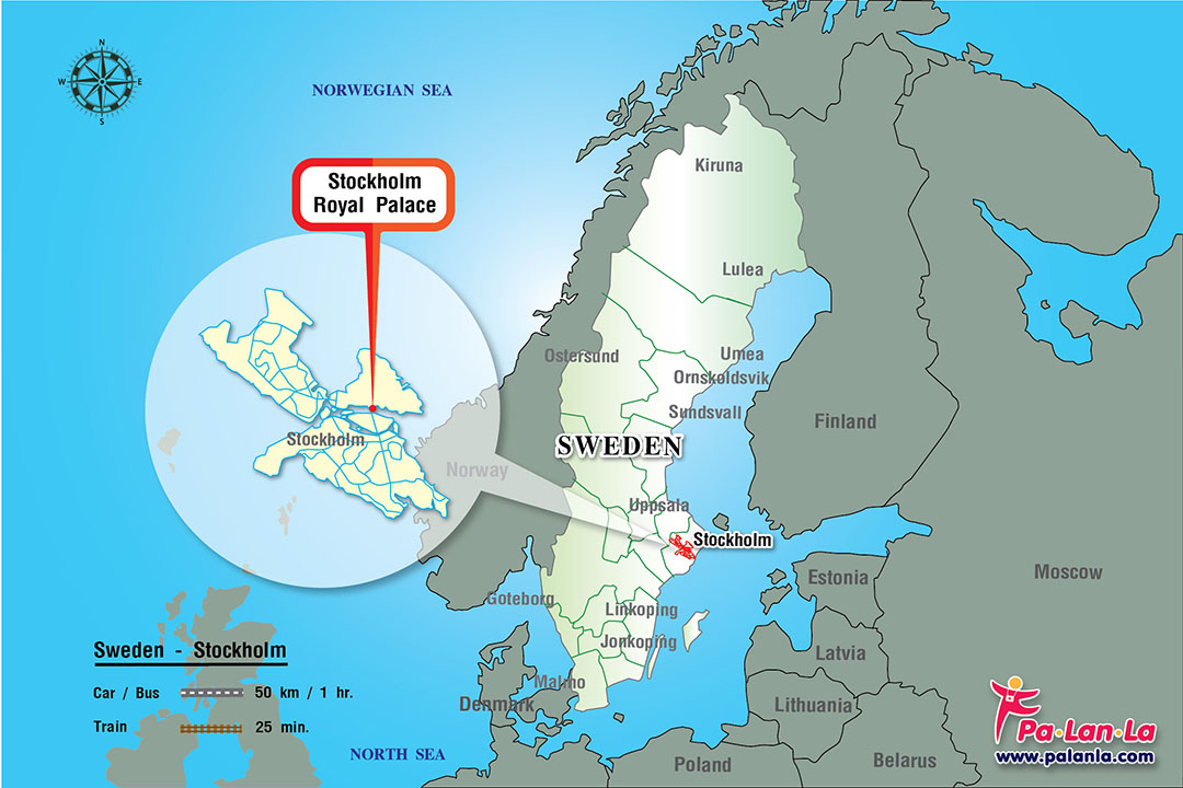 - เครื่องบิน ขึ้นเครื่องบินจากสนามบินสุวรรณภูมิไปลงที่ท่าอากาศยานสตอกโฮล์ม-อาร์ลันดา (Stockholm Arlanda Airport) ใช้เวลาเดินทางโดยเครื่องบินประมาณ 12 ชั่วโมง