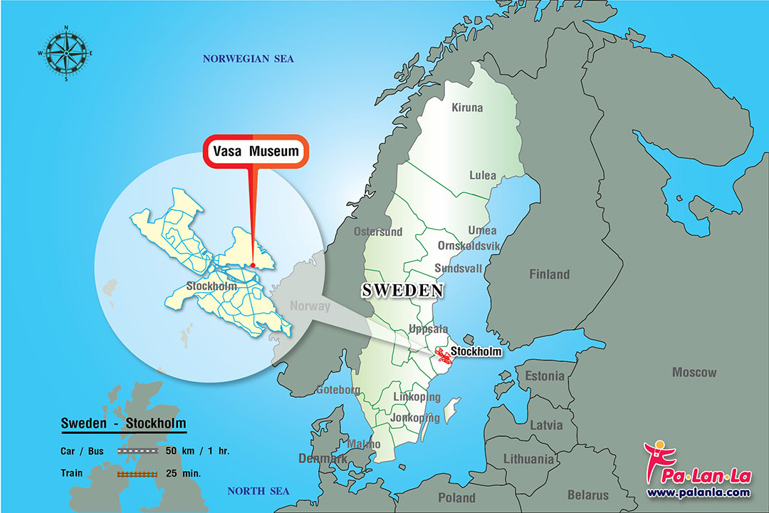 แผนที่ตั้ง พิพิธภัณฑ์วาซา (Vasa Museum) กรุงสตอกโฮล์ม ประเทศสวีเดน (ระยะทางจากท่าอากาศยานสตอกโฮล์ม-อาร์ลันดาไปยังใจกลางเมือง)