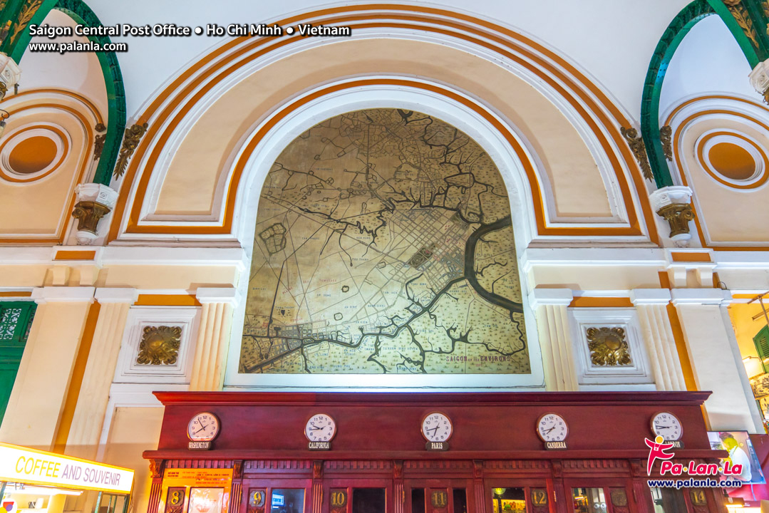 ภายในตัวอาคารประดับภาพของอดีตผู้นำประเทศอย่างโดดเด่นสะดุดตา และภาพแผนที่ขนาดใหญ่สองภาพซึ่งสร้างขึ้นหลังจากสร้างที่ทำการไปรษณีย์ แผนที่แรกตั้งอยู่ทางด้านซ้ายของอาคารเป็นแผนที่ของเวียดนามตอนใต้และกัมพูชา ชื่อภาพ Lignes telegraphiques du Sud Vietnam et Cambodia 1892 แผนที่ที่สองเป็นแผนที่ของไซ่ง่อนและบริเวณโดยรอบ มีชื่อภาพว่า Saigon et ses environs 1892