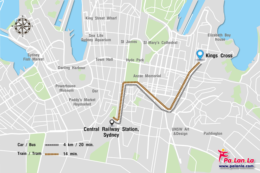 - รถประจำทาง สาย 200, 311 ลงป้าย Kings Cross Station, Darlinghurst Rd.