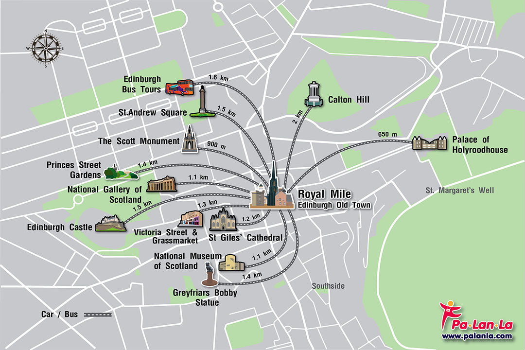 การเดินทาง : เดินจากสถานี Edinburgh Waverley ไปยัง ถนนเมืองเก่ารอยัลไมล์ มีระยะทาง 150 เมตร ใช้เวลาเดินทางประมาณ 2 นาที