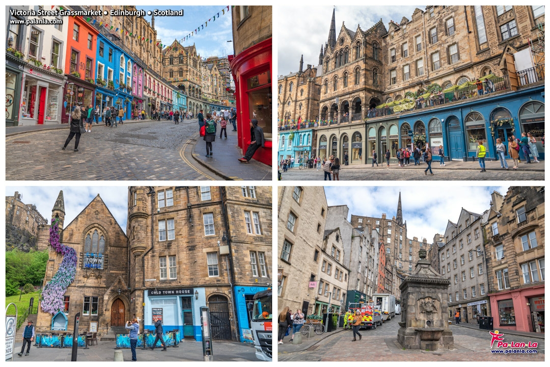 ถนนวิกตอเรีย และ ตลาดแกรสมาร์เก็ต (Victoria Street & Grassmarket) อยู่บริเวณใจกลางย่านเมืองเก่า บริเวณนี้มีชื่อเสียงโด่งดังไปทั่วโลกจากซีรีย์แฮร์รี่ พอตเตอร์ เพราะเป็นย่านที่เจ.เค.โรว์ลิ่งเคยอาศัยอยู่ และนั่งเขียนต้นฉบับที่ร้านกาแฟ The Elephant House โดยผู้คนมักจะมาตามรอยกันที่บริเวณหัวโค้งท้ายถนนที่เชื่อมต่อไปยังตลาดแกรสมาร์เก็ต ซึ่งว่ากันว่าบริเวณดังกล่าวเป็นฉากที่สร้างแรงบันดาลใจในการเขียนเรื่องราวเกี่ยวกับตรอกไดแอกกอนนั่นเอง สำหรับตลาดแกรสมาร์เก็ตจะมีการตั้งแผงตลาดนัดทุกวันเสาร์ตลอดทั้งปี