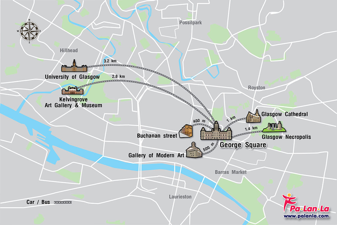 แผนที่ 7 สถานที่ท่องเที่ยวยอดนิยมในเมืองกลาสโกว์ประเทศสกอตแลนด์