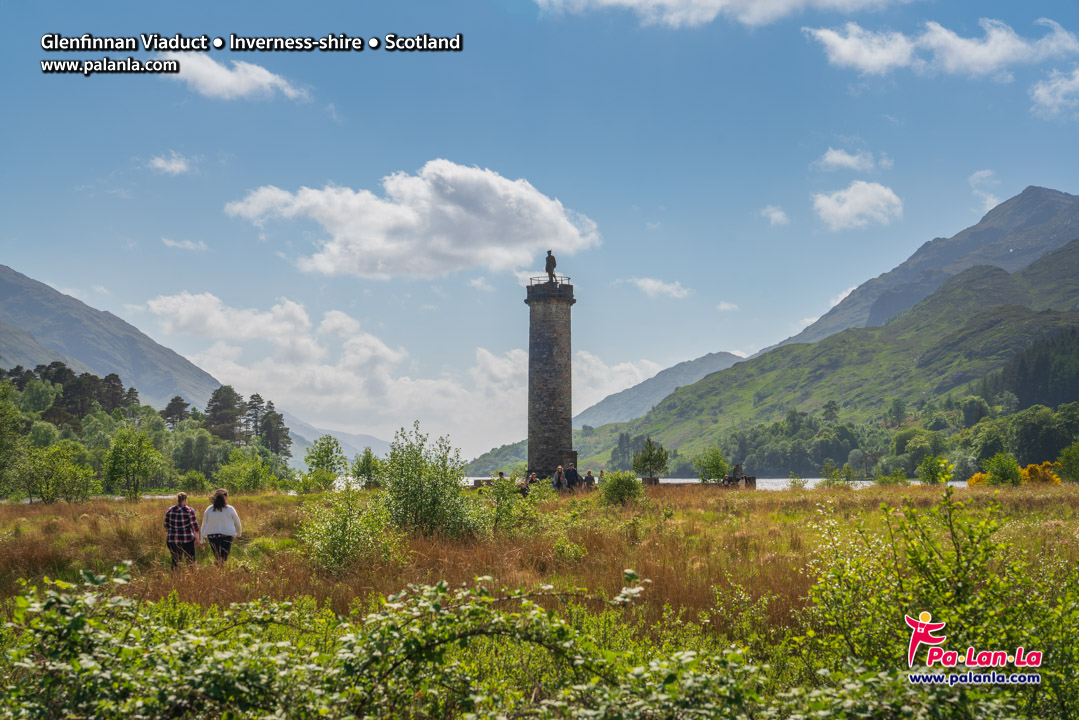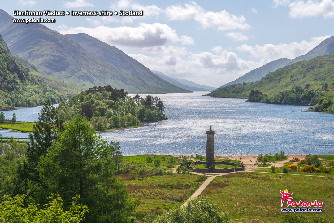 อนุสาวรีย์เกล็นฟินแนนที่มีฉากหลังเป็นทะเลสาบน้ำจืดล็อกชิเอล