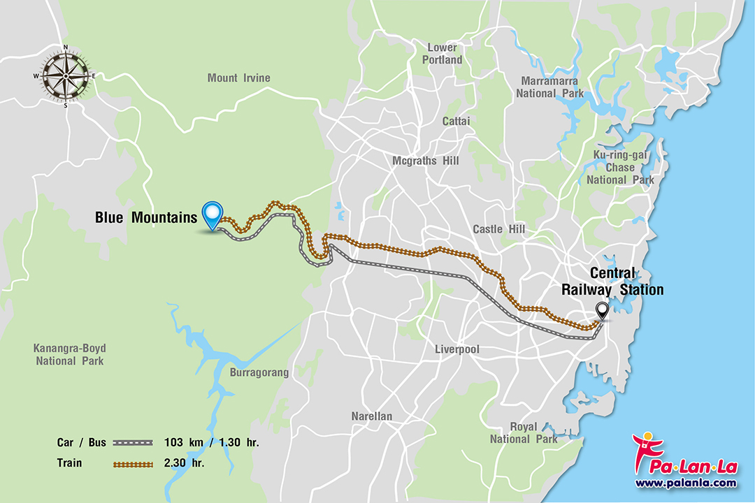 - รถไฟ สาย Lithgow โดยให้ลงที่สถานี Katoomba ใช้เวลาในการเดินทางประมาณ 2 ชั่วโมง
