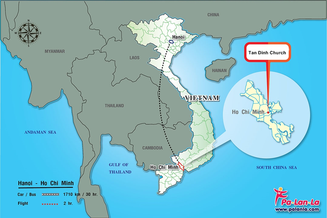 จากท่าอากาศยานนานาชาติโฮจิมินห์ ไป โบสถ์ทันดินห์ มีระยะทาง 5.8 กิโลเมตร ใช้เวลาในการเดินทางโดยรถยนต์ประมาณ 20 นาที