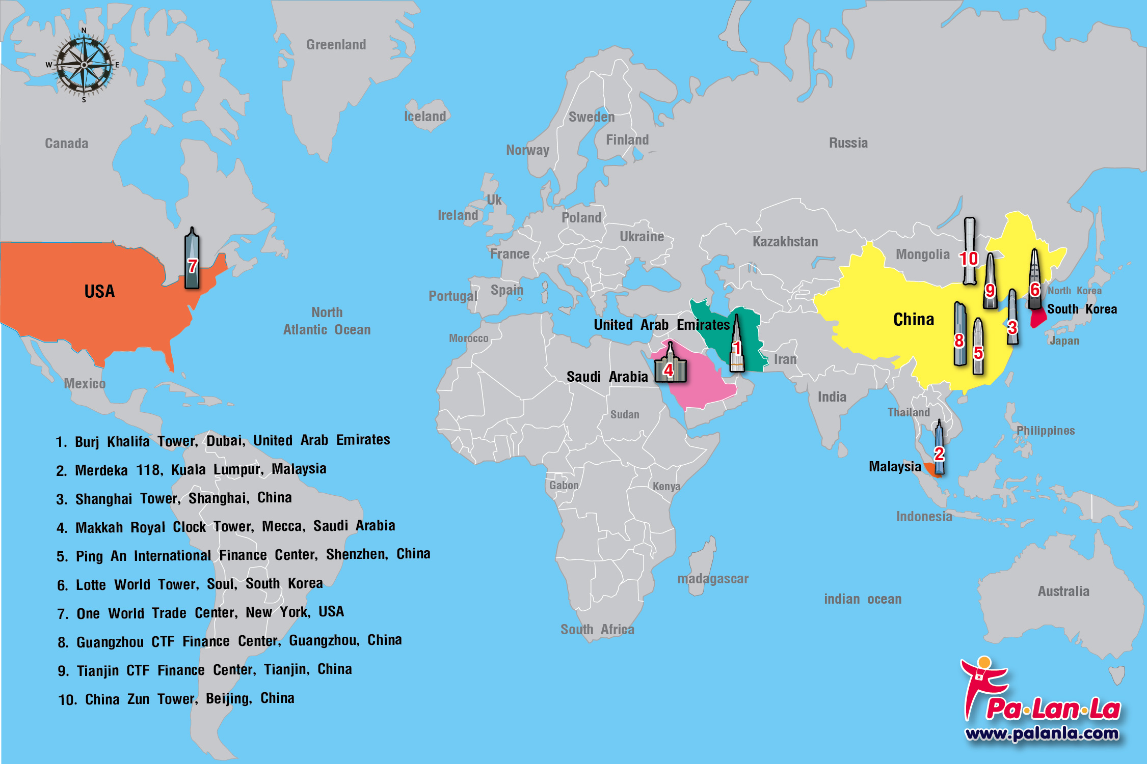 นอกเหนือจากองค์ความรู้ และความสามารถของบุคลากรภายในประเทศ ซึ่งจะเป็นสิ่งที่สามารถชี้วัดศักยภาพทางด้านเทคโนโลยี และความเจริญก้าวหน้าทางเศรษฐกิจได้แล้ว ยังมีอีกสิ่งหนึ่งที่บ่งชี้สถานะทางการเงินของประเทศได้ นั่นก็คือ โครงสร้างของอาคารที่ยิ่งใหญ่ สูงเสียดฟ้า สวยงามตระการตา และทันสมัย ที่ทำหน้าที่เป็นทั้งสถานปฏิบัติการ สถาบันการเงิน ที่พักอาศัย ตลอดจนเป็นจุดชมวิวสำคัญของเมืองในประเทศนั้นๆ วันนี้ Palanla จะพาไปชมตึกระฟ้าที่ถูกจัดอันดับว่าเป็นตึกที่สูงที่สุดในโลกกันค่ะ