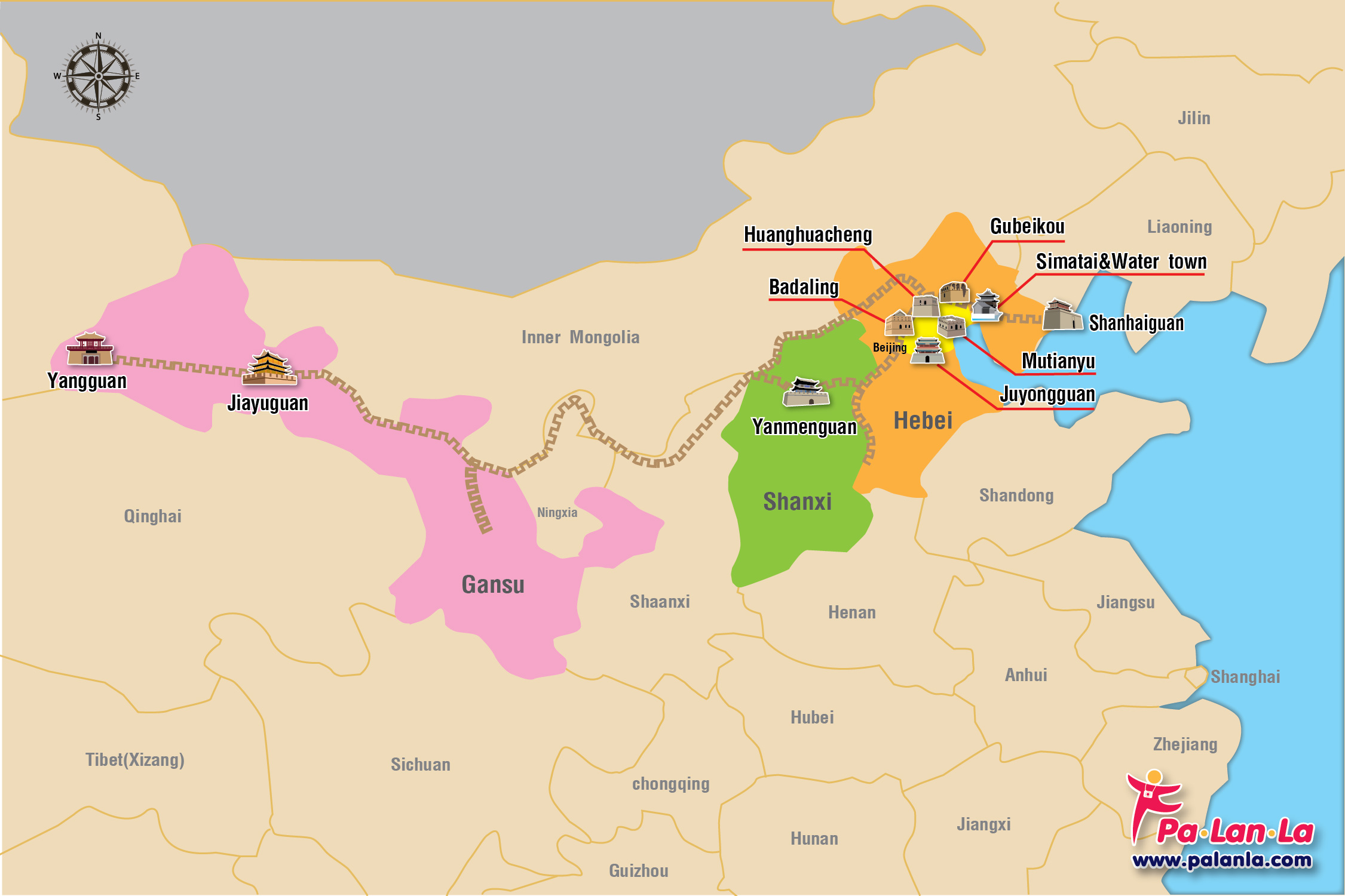 ผลจากการก่อสร้างที่มีระยะเวลาหลายร้อยปี ในหลายยุคหลายสมัยบนภูมิประเทศตามเมืองและมณฑลสำคัญหลายแห่ง อาทิ เมืองปักกิ่ง, มณฑลเหอเป่ย, มณฑลซานซี, มณฑลกานซู่ ที่แตกต่างกันออกไป จนในปี ค.ศ. 2012 ได้มีการประกาศความยาวรวมของกำแพงเมืองจีนทั้งหมด ว่ามีระยะทางถึง 21,196 กิโลเมตร ด้วยความยิ่งใหญ่และความมหัศจรรย์แห่งนี้เอง ทำให้กำแพงเมืองจีนแต่ละจุด เต็มไปด้วยเสน่ห์เฉพาะตัวอันน่าค้นหา และทิวทัศน์อันสวยงามเป็นเอกลักษณ์ที่รอให้นักท่องเที่ยวไปสัมผัส ซึ่งวันนี้ทาง Palanla ได้รวบรวม 10 กำแพงเมืองจีนสำคัญที่ไม่ควรพลาด ตั้งแต่จุดเริ่มต้นทางตะวันออก ไปจนถึงทางตะวันตกมาไว้ให้ได้ชมกันค่ะ