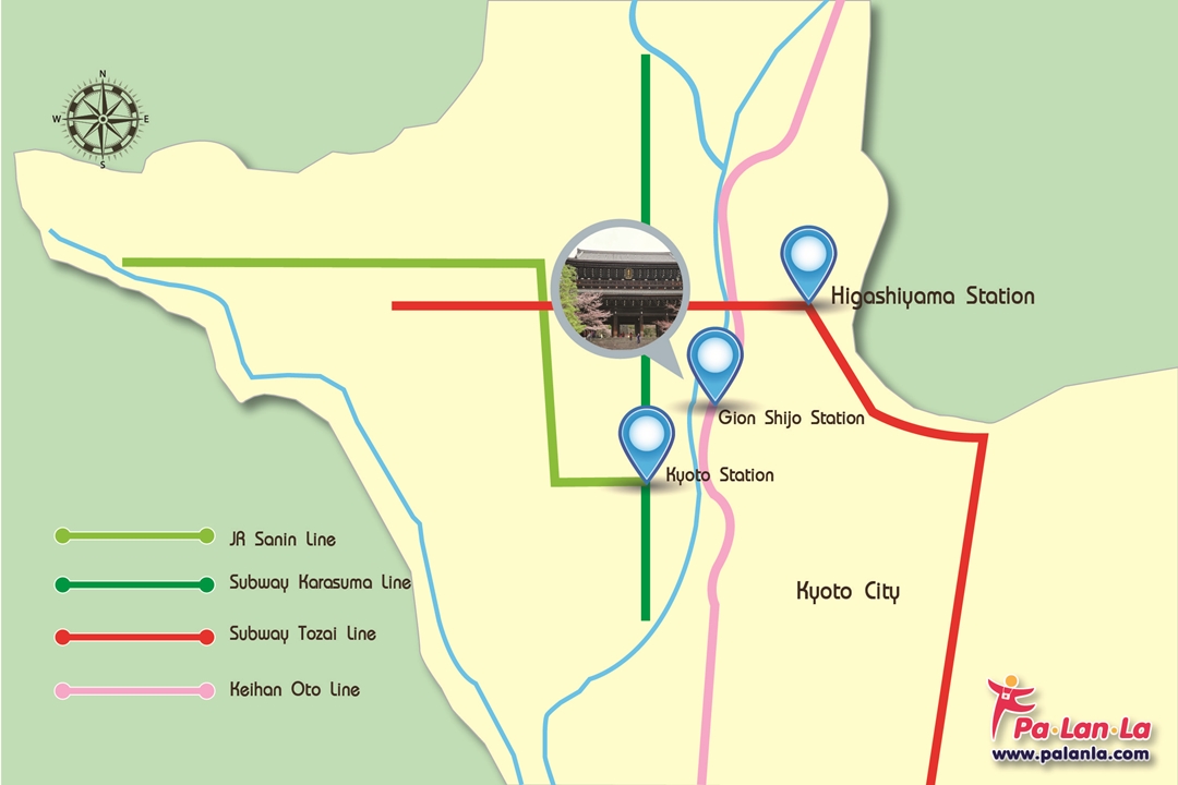 - รถไฟ ขึ้นรถไฟใต้ดินสาย Tozai มาลงที่ สถานี Higashiyama จากนั้นเดินต่ออีกประมาณ 700 เมตร ค่าโดยสารเริ่มต้นที่ 210 เยน