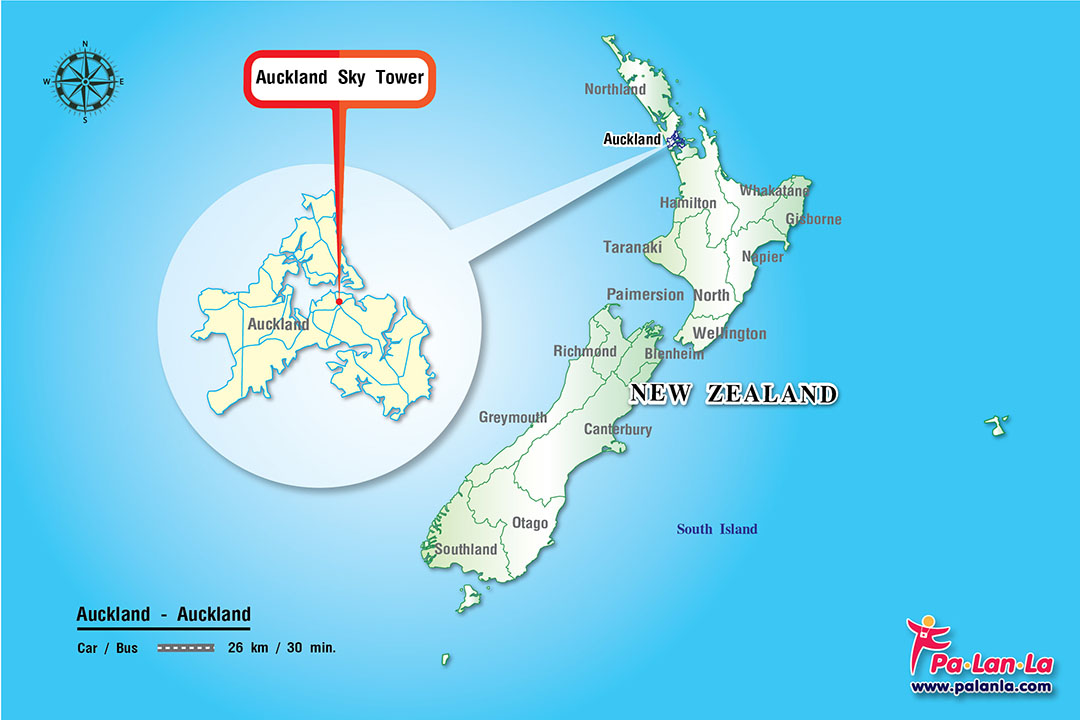แผนที่ตั้ง โอ๊คแลนด์สกายทาวเวอร์ (Auckland Sky Tower) เกาะเหนือ ประเทศนิวซีแลนด์