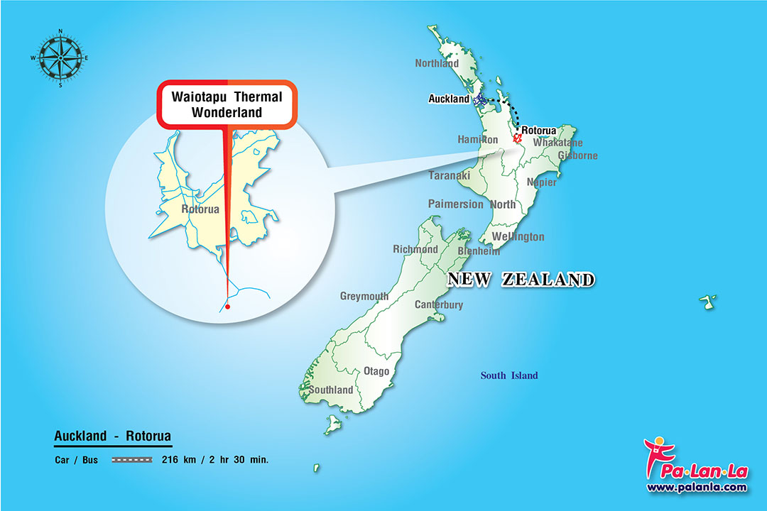 แผนที่ตั้ง ไวโอตาปูเทอร์มอลวันเดอร์แลนด์ (Waiotapu Thermal Wonderland) เกาะเหนือ ประเทศนิวซีแลนด์
