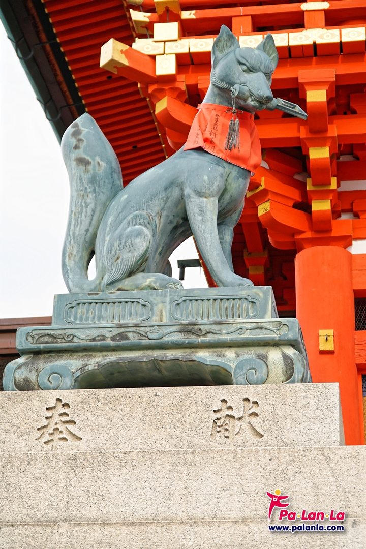 รูปปั้นสุนัขจิ้งจอกที่ตั้งอยู่บริเวณทางเข้าศาลเจ้า