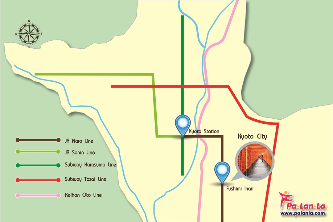 - รถไฟ สาย JR Nara ลงที่สถานีรถไฟ JR Inari ค่าโดยสารเริ่มต้นที่ 140 เยน และสาย Keihan Main Line ลงที่สถานี Fushimi Inari ค่าโดยสารเริ่มต้นที่ 150 เยน