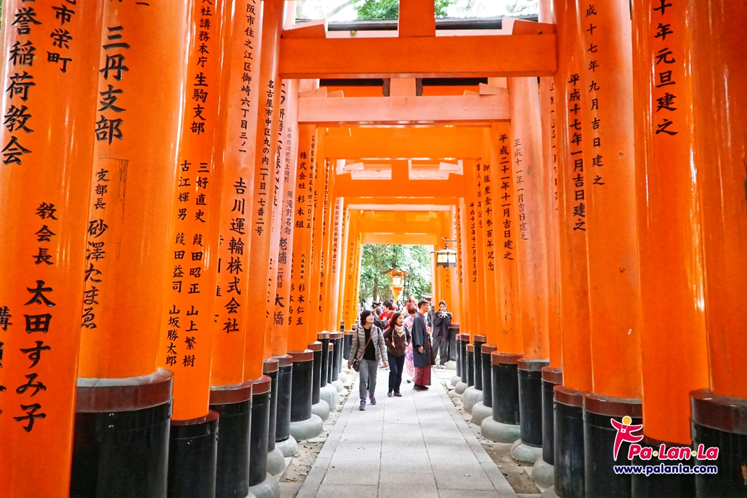 เส้นทางเดินลอดเสาโทริอิที่วางเรียงติดกันซึ่งเป็นสัญลักษณ์ของศาลเจ้าฟูชิมิ อินาริ